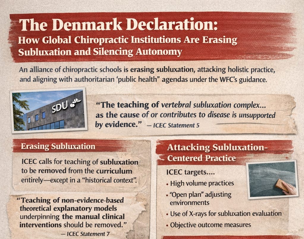 Phillip Ebrall warned us that the University of Southern Denmark had fallen in line. He was right. But the ICEC document shows it’s far worse: entire institutions are being reprogrammed to serve a model of chiropractic that rejects subluxation, denies innate intelligence, and aligns itself with globalist health policy.